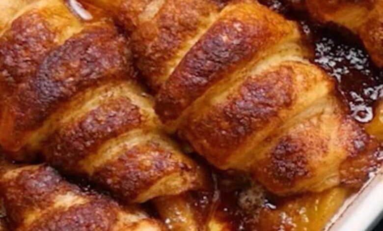 The dough is rolled around portions of canned peaches and drizzled with peach syrup, butter, and cinnamon sugar before baking to perfection.