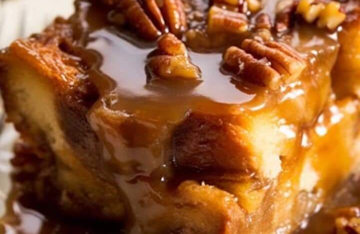 Let it stand for a few moments post-cooking. As you serve, drench the warm slices with caramel sauce, perhaps even a sprinkle of pecans or a dusting of powdered sugar for that picture-perfect finish.
