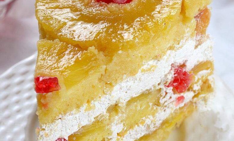 Pineapple Upside Down Bundt Cake is a delicious dessert that combines the flavors of a classic pineapple upside-down cake with the beautiful presentation of a bundt cake. It typically features a moist and buttery cake with caramelized pineapple rings and maraschino cherries on top. Here’s a basic recipe to help you make your own Pineapple Upside Down Bundt Cake: