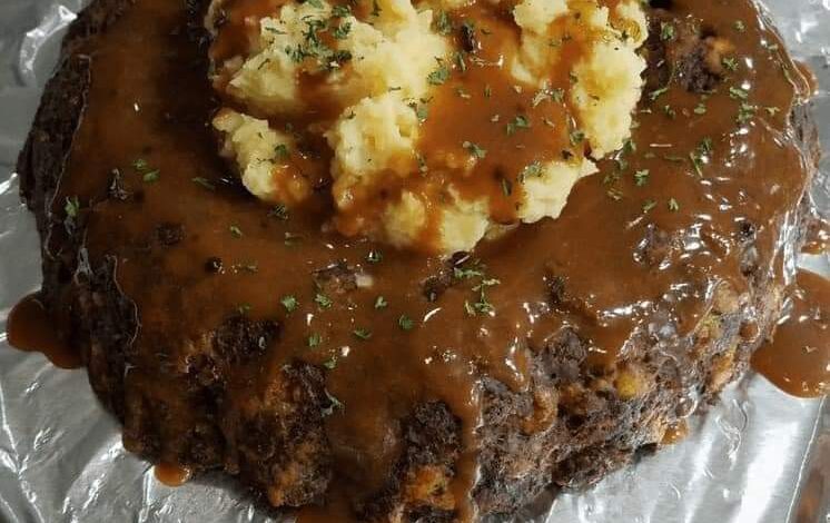 - Serve with mashed potatoes and brown gravy in the center of the meatloaf.
