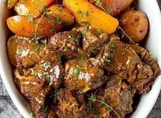 Re-serve the beef in the pot. Carrots and potatoes should be placed around the steak in the soup. Cook for 2 1/2 to 3 hours at 350 degrees Fahrenheit, covered.