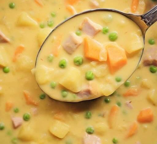 In a sizable stockpot, combine onions, carrots, potatoes, and ham. Pour in 3 cups of chicken broth and allow it to simmer until the vegetables are tender, roughly 20-30 minutes.