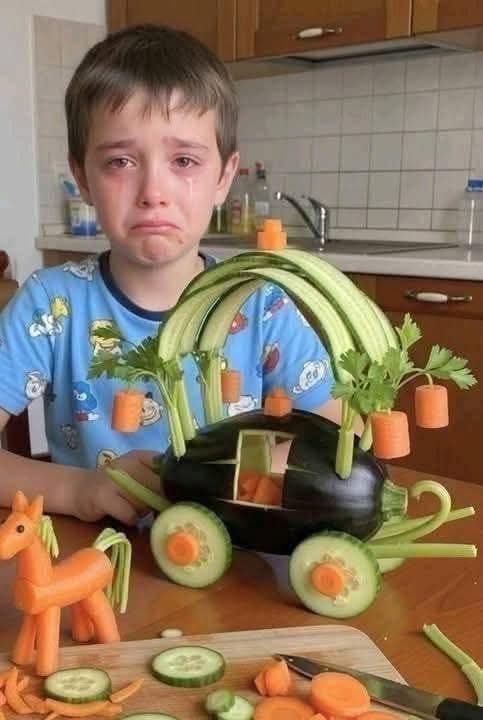 Cucumber slices became windows, arches, and delicate decorations. A bit of parsley added a royal touch. And, of course, he needed a horse—one made entirely from carefully carved carrot pieces, with a celery tail and the proud stance of a storybook stallion.