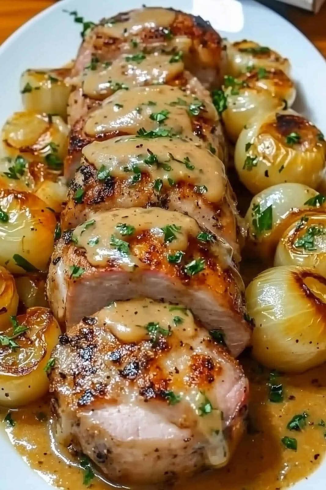 When it comes to comfort food elevated to gourmet status, this dish takes center stage. It’s the perfect balance of elegance and heartiness—tender, juicy pork wrapped in the savory embrace of slow-caramelized onions and finished with the punchy sophistication of **aged mustard**.