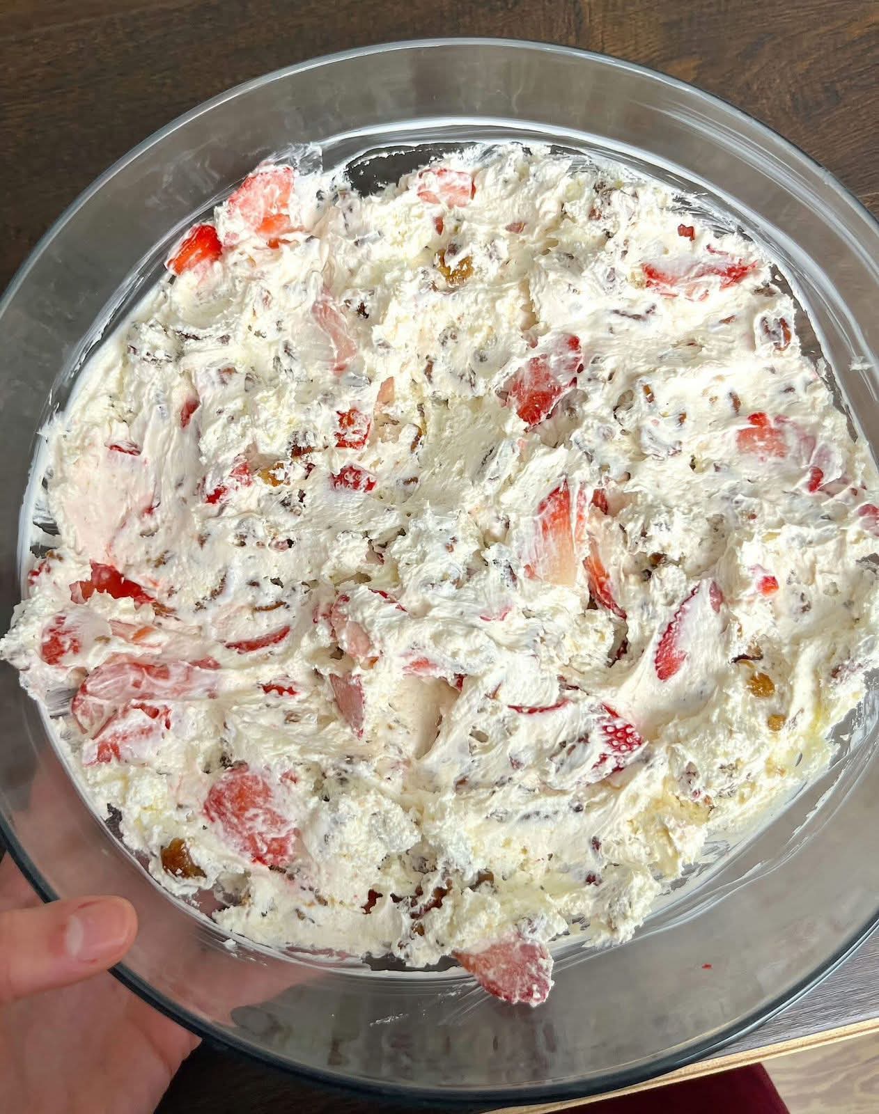 5. Fold in strawberries & crackle: Add the sliced strawberries and most of the cooled pretzel-pecan crackle to the cream mixture, reserving some for garnish. Fold gently to keep the filling light.